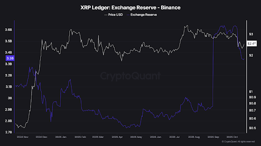 Meanwhile, data from CryptoQuant shows XRP reserves on Binance fell sharply, from above 3.5 billion to under 3 billion XRP. This drop indicates major outflows from the exchange, often linked to holders moving funds into private storage.