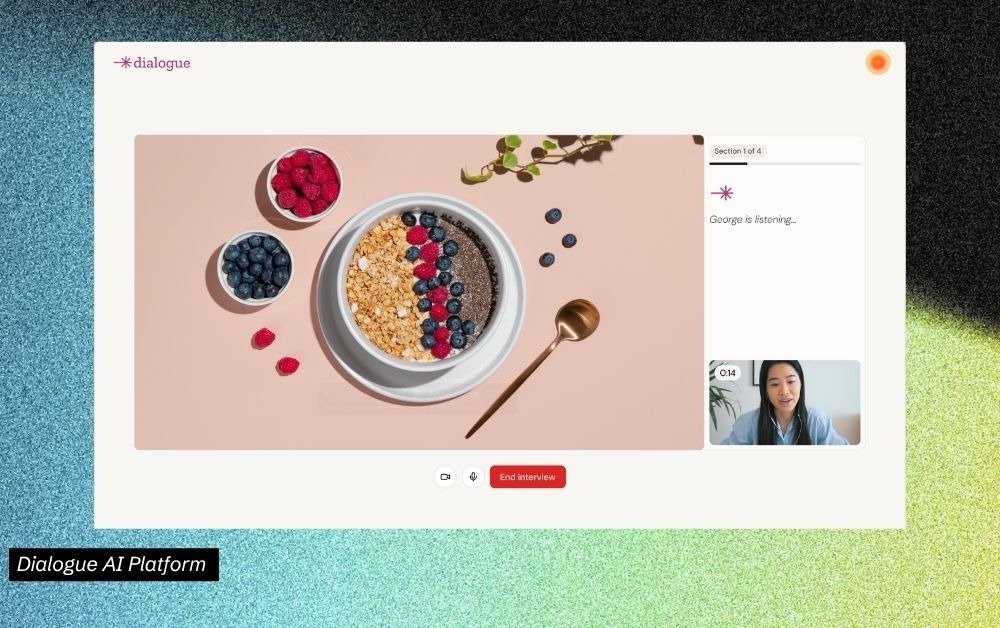 Dialogue AI’s tech works by sourcing participants and creating best practices for research studies. Provide the AI chatbot with learning objectives, and it produces a best-practice research plan. Then, the AI interviewer runs hundreds of interviews, with insights synthesized in real-time.