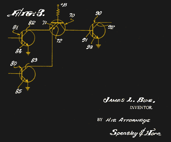 I thought perhaps the original patent for TTL would shed some light on the rationale for five volts, but like most inventors, James Buie left things as broad and non-specific as possible in the patent. He refers only to “B+” and “B-” in the schematics and narrative, although he does calculate that the minimum for B+ would be 2.2 V. Later on, he states that “the absolute value of the supply voltage need be greater than the turn-on voltage of the coupling transistor and that of the output transistor,” and in the specific claims section, he refers to “a source of EMF” without specifying a magnitude. As far as I can see, nowhere in the patent does the five volt spec crop up.