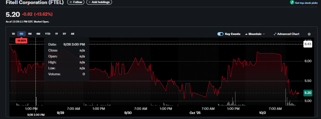 Despite the high-profile purchase, Fitell’s stock has come under pressure. Shares of FTEL closed at $5.20 on October 2, down 13.62% on the day and nearly 15% over the past five trading sessions.