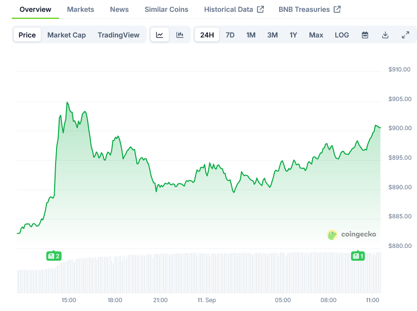 BNB is currently trading at $883.69, showing a modest daily gain of 0.42%. The token is consolidating just below the key $900 resistance level, which has capped gains in recent trading sessions.