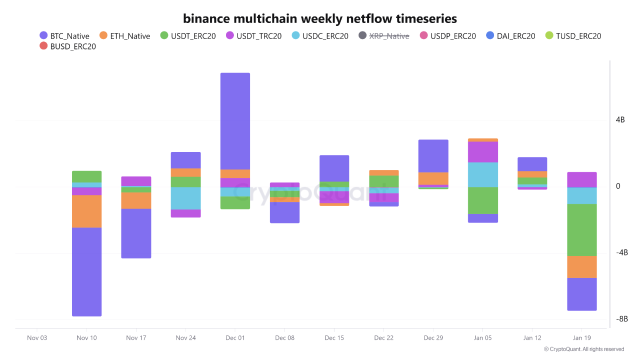 Binance experienced its largest weekly asset withdrawal since November 10, with over $6 billion leaving the exchange across multiple blockchain networks.