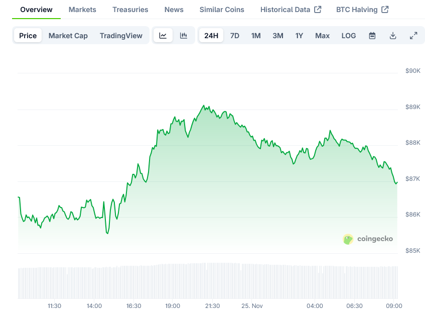 Bitcoin is currently trading near $86,000 as of November 24, 2025, based on spot trading data from Brave New Coin. The price represents a rebound from weekend lows near $84,500 following multiple attempts to break through the $88,000 to $90,000 resistance zone.