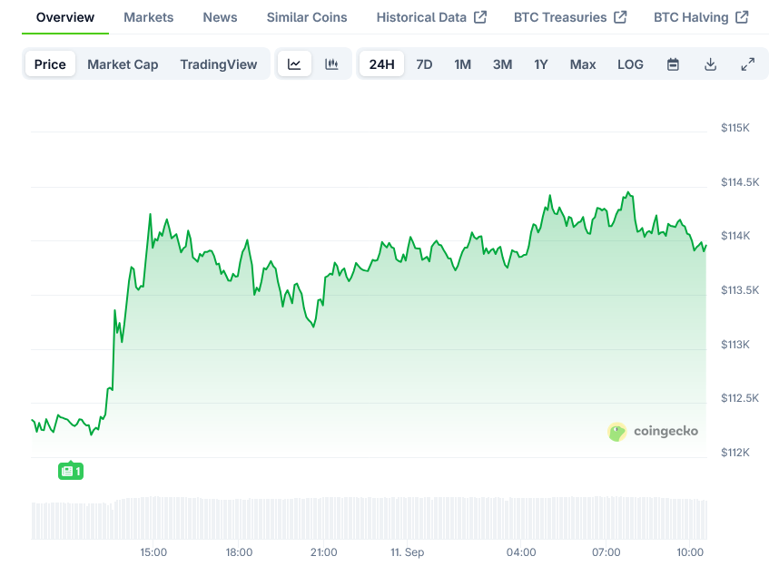 BTC rose above $114,000 on Wednesday after the release of the Producer Price Index (PPI) report, which came in below expectations. The PPI fell 0.1% in August, following a 0.7% increase in July, when economists had predicted a 0.3% rise.