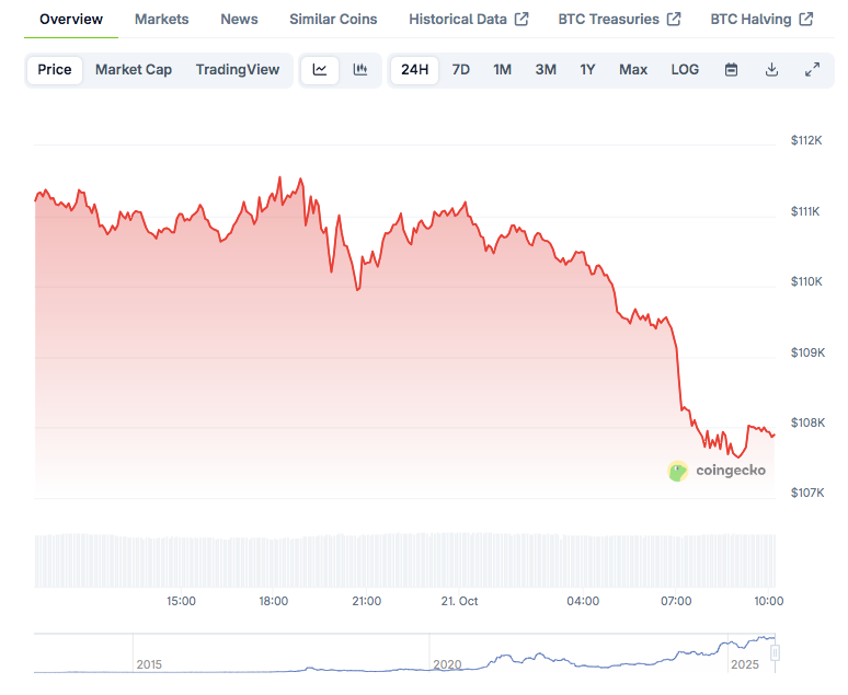 The latest data shows BTC at $107,996 with a 24-hour trading volume of $59.56 billion. Prices are down 2.92% in the last day and 4.45% across the week. Earlier this month, Bitcoin touched $124,000 before losing momentum.