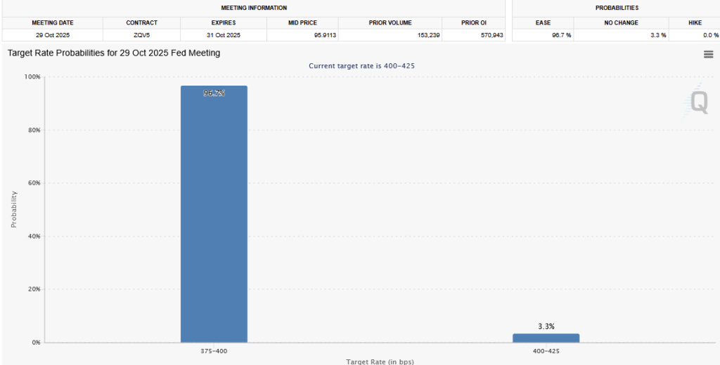 According to the latest CME FedWatch data, markets are pricing in a 96.7% probability of a 25-basis-point reduction in the federal funds rate, from 4.00–4.25% to the 3.75–4.00% range. Only 3.3% of traders expect no change.