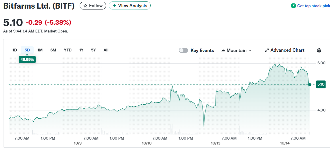 Bitfarms stock rocketed 28.3% on Monday to close at $5.39. The Bitcoin mining company led a sector-wide rally after President Trump reversed course on threatened Chinese tariffs.