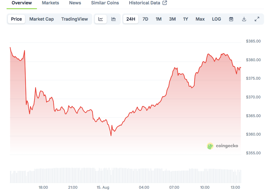 Data from CoinGecko shows TAO changing hands at $378.45, down 1.21% over 24 hours but up 1.62% in the past week. Trading volume stands at $188.9 million, indicating active participation despite the range.