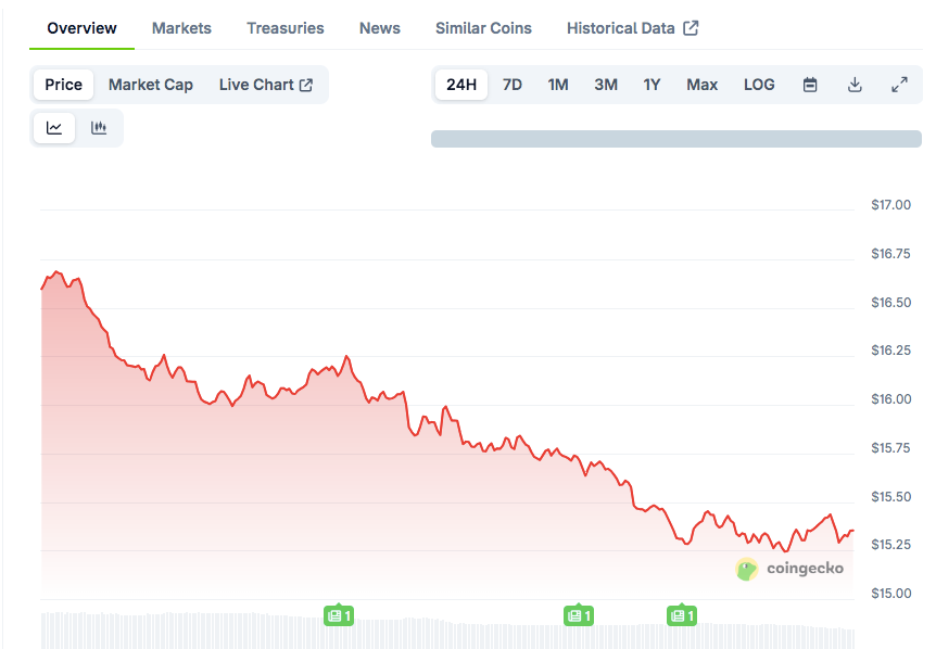 Wu Blockchain reported that the ETF’s DTCC listing contributed to renewed speculation about further institutional integration, though no regulatory decisions have been confirmed. Trading volume has remained elevated, signaling growing participation from retail and institutional desks. The $15 support zone as a crucial short-term level for maintaining bullish structure.
