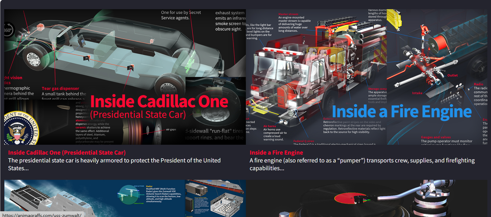 On the Animagraffs site you can view cool animated infographics of how things work. If you’ve ever wanted to know how a car engine works or how a fire truck works then you’ll be thrilled with those animated infographics. You can also view animated infographics for how an F1 race car works, how self-driving cars work and how a pair of speakers make sound. Each infographic is presented with intricate detail so you can really work your imagination. My favorite is an animated infographic of the P-51 Mustang fighter plane from WWII.