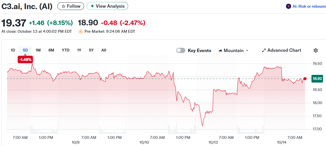 Monday’s rally proved short-lived for C3.ai. Within 24 hours, shares fell over 5% as AI-focused software companies faced a renewed sell-off.