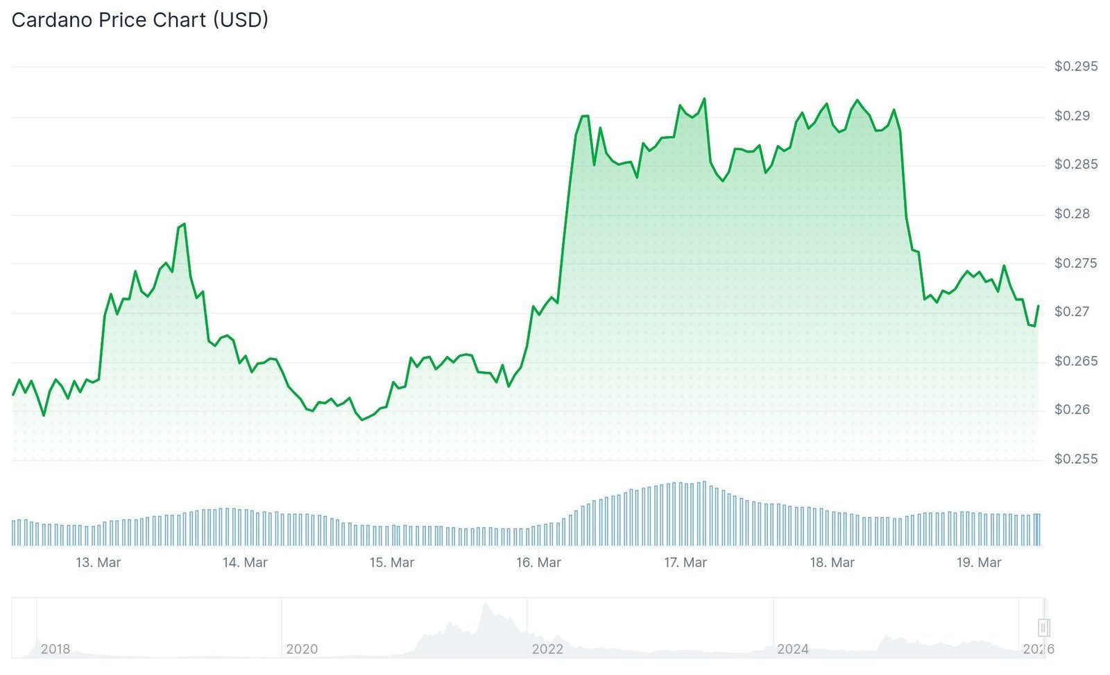 Cardano (ADA) is currently changing hands near the $0.27 mark, positioned within a historically significant accumulation area that has preceded previous bullish cycles. The token remains approximately 79% below its peak valuation of $3.10 established in 2021.
