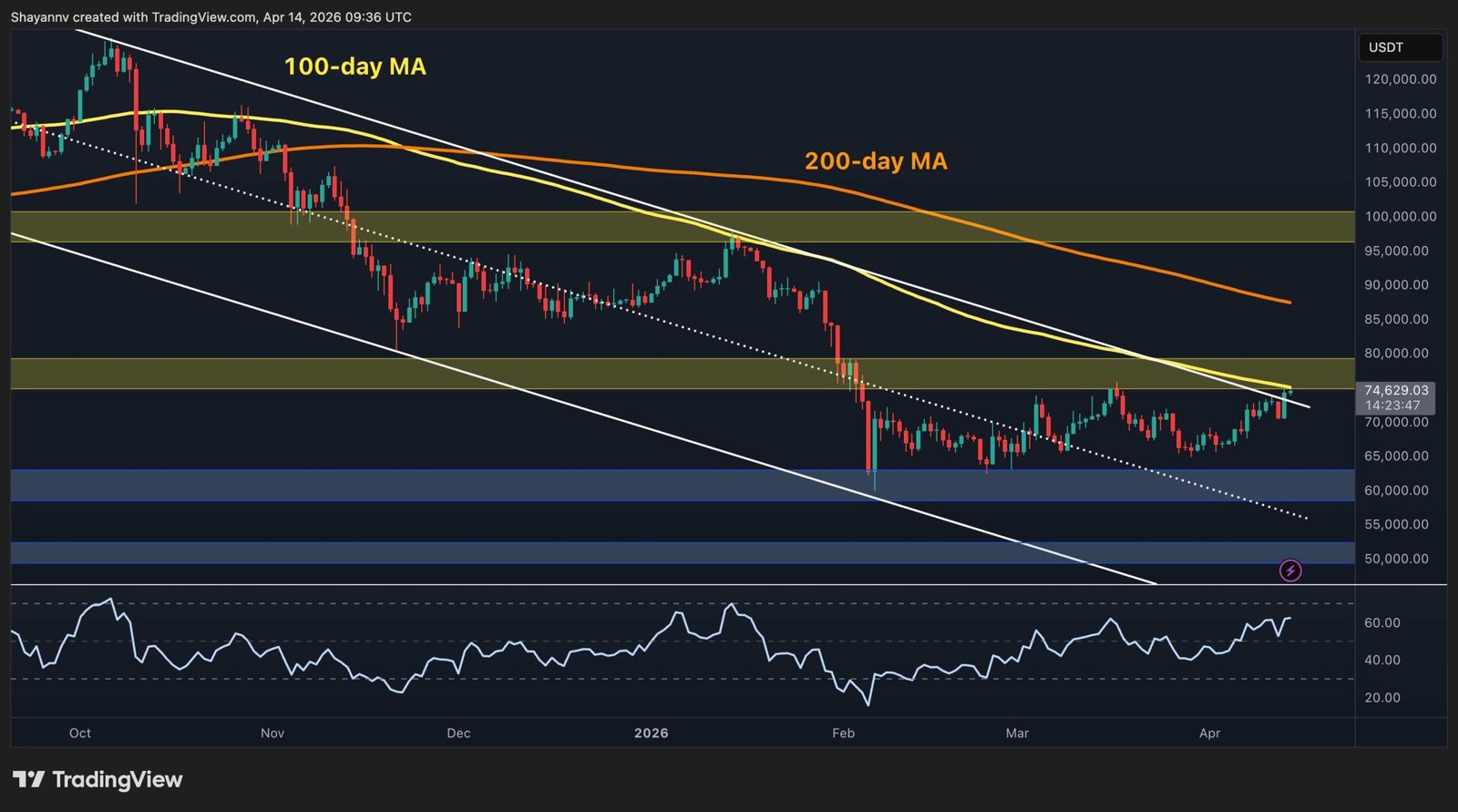 Bitcoin is trading around $74.6k, posting one of its more meaningful recovery moves in recent weeks. The market is responding to improving geopolitical sentiment surrounding the US-Iran ceasefire negotiations. The broader downtrend has not been reversed yet, but the recent push is the closest BTC has come to challenging key structural resistance since the February BTC Analysis, Crypto News, Bitcoin (BTC) Price