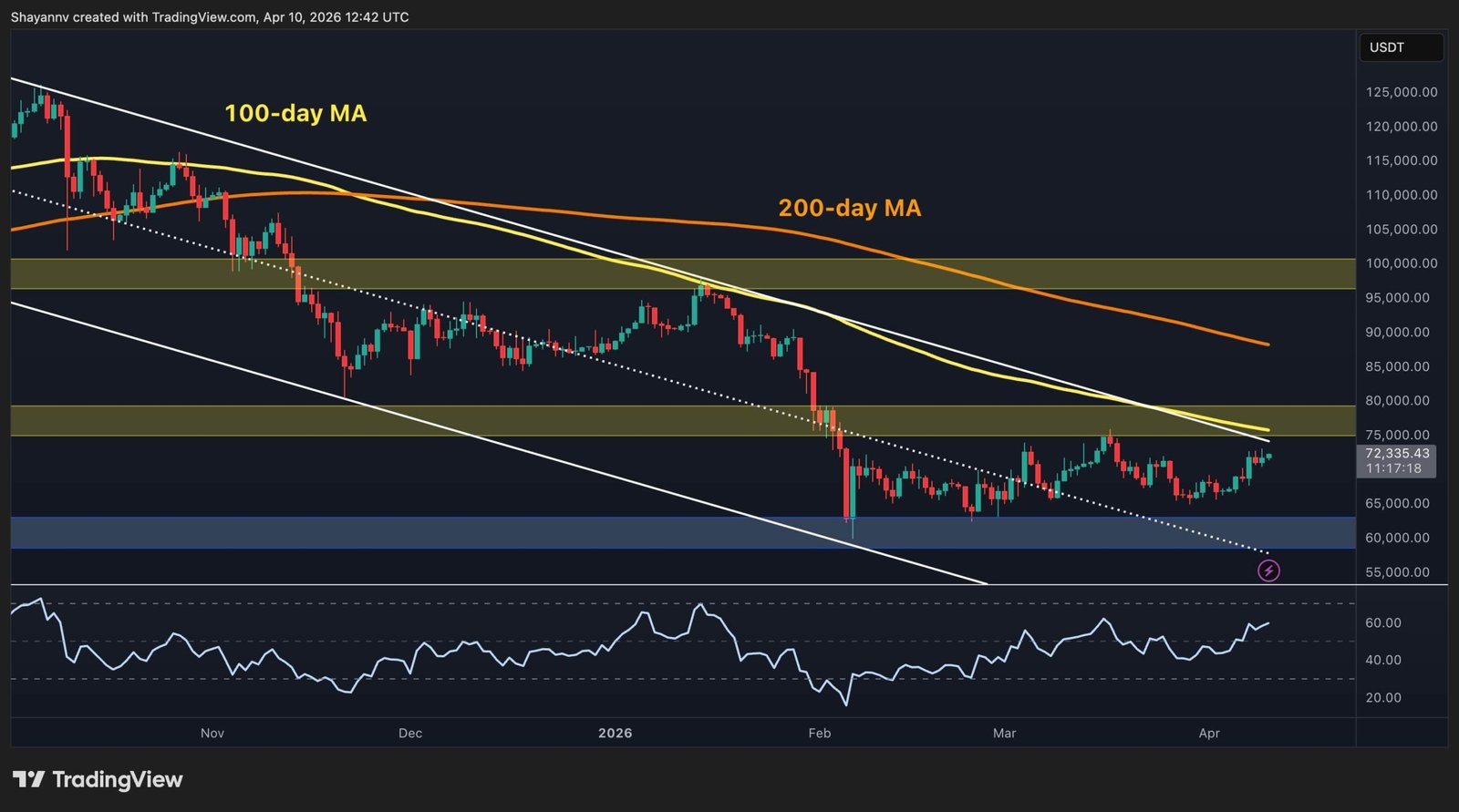 That said, the RSI has been trending upward since the March lows and is now approaching the 60s. This is the most constructive daily momentum reading since before the February crash. The key support level at $60k continues to hold, and a push through $75k and above the 100-day moving average on strong volume would be the first genuine sign that the trend is shifting.