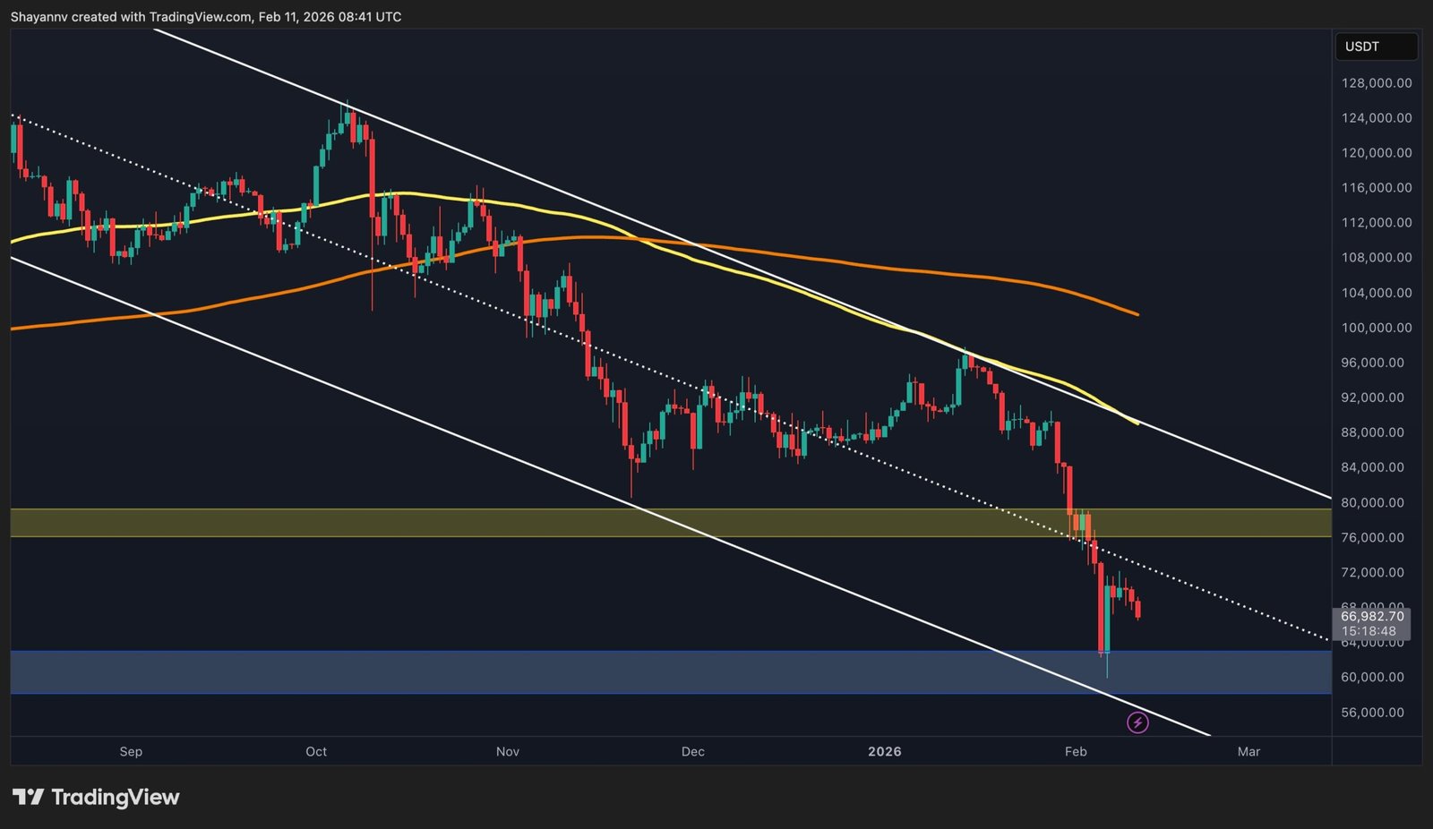 Historically, such extreme negative funding prints tend to appear during panic-driven sell-offs, when the market becomes crowded on the short side. The current structure suggests that derivatives traders are heavily positioned for further downside following the breakdown below the $70K area.
