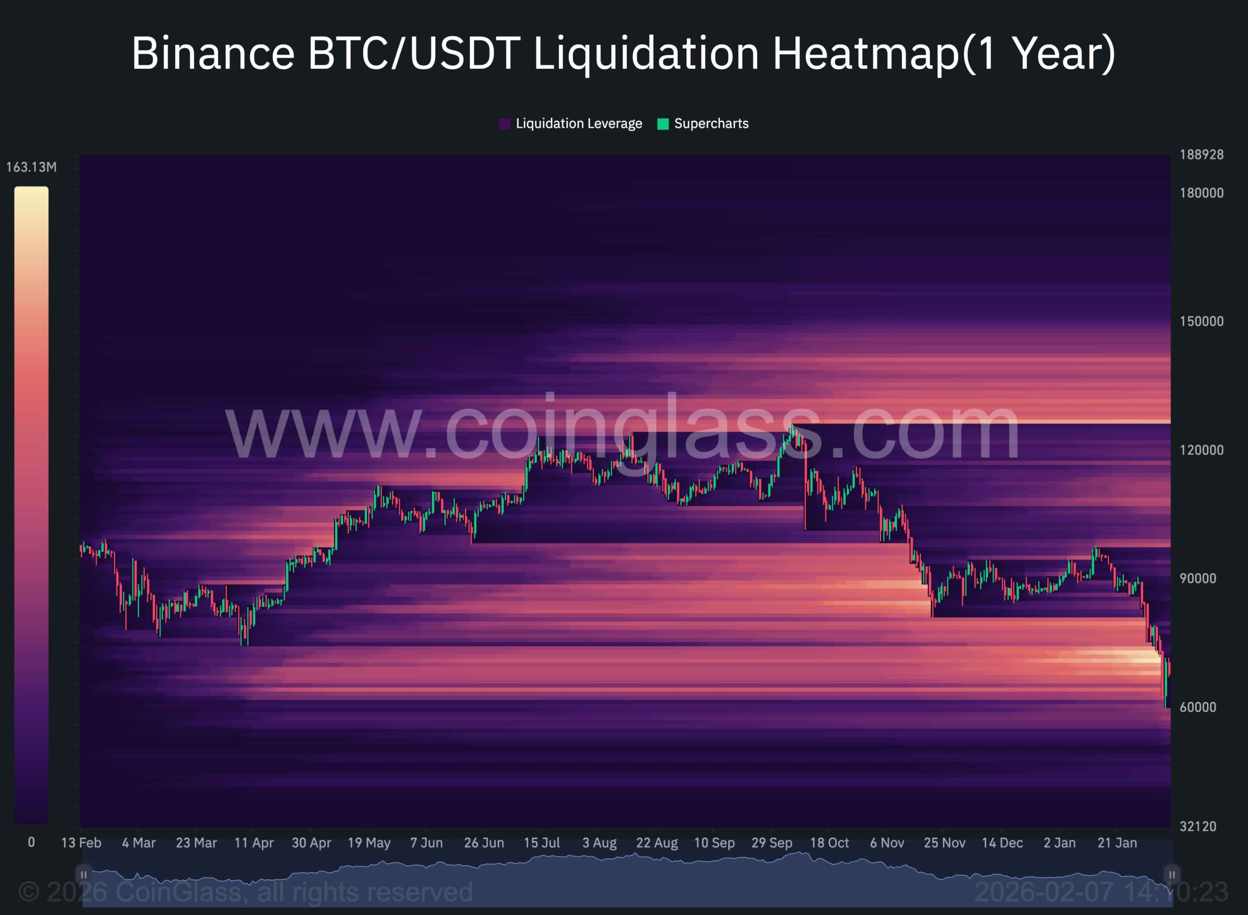 The liquidation heatmap provides valuable context for the recent price behavior. The one-year BTC/USDT liquidation heatmap shows a dense liquidity pocket concentrated around and slightly below the $60K–$65K region, which aligns closely with the current price area. This clustering of liquidity suggests that this zone has been a magnet for price, driven by forced liquidations of over-leveraged long positions during the recent sell-off.