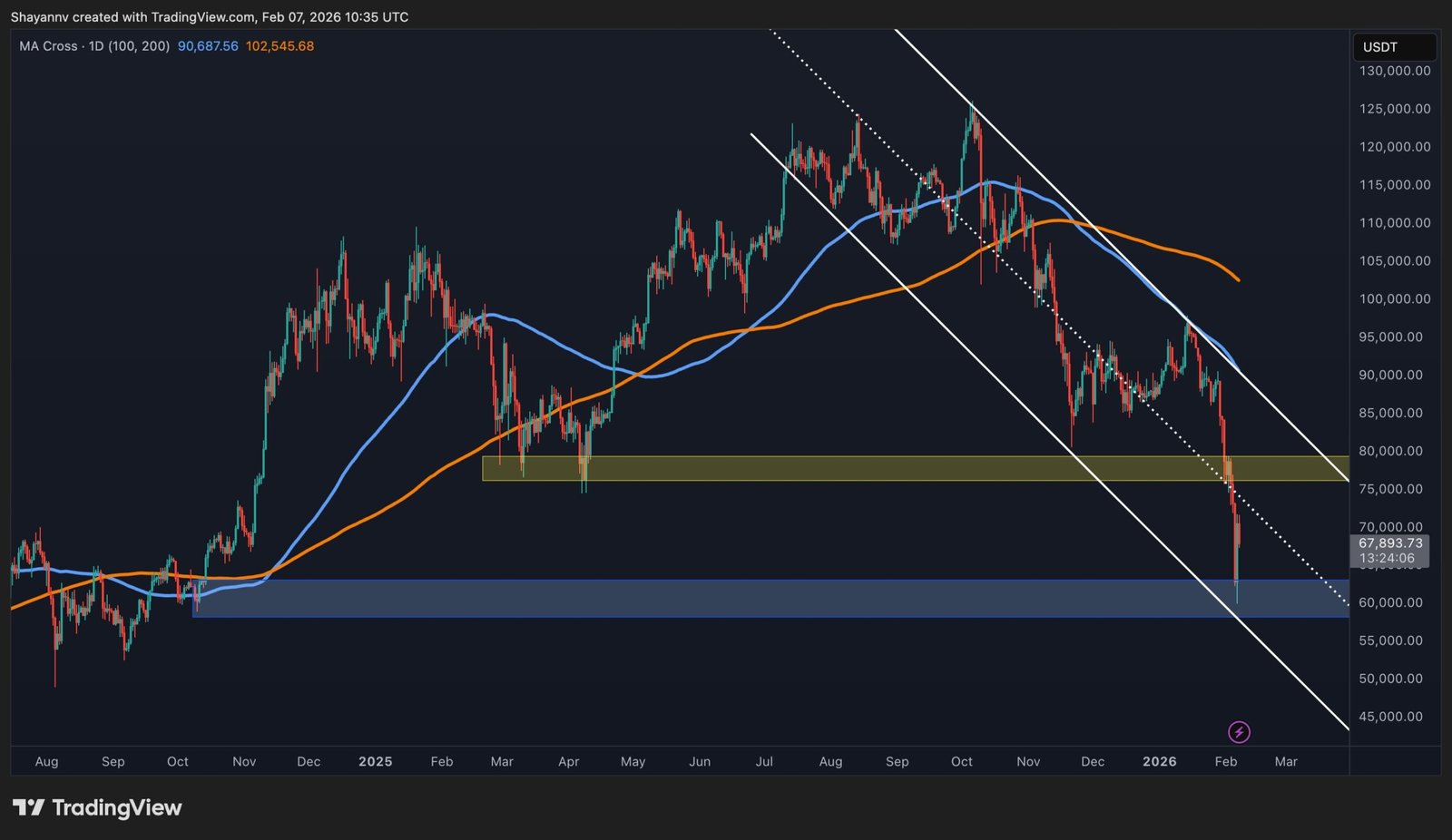On the daily timeframe, Bitcoin has decisively broken below its recent structure and continued to respect the descending channel, while the rejection from the middle boundary of $75K confirms that sellers remain firmly in control. The most important development is the impulsive breakdown toward the lower boundary of the channel, where the asset is now testing a major demand zone at the $60K price region that previously acted as a strong buyers’ base earlier in the cycle.