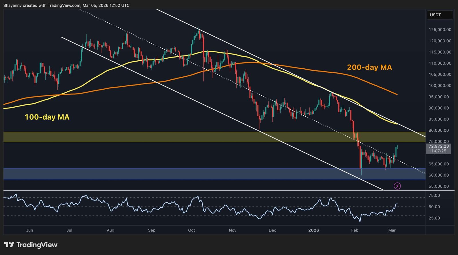 On the 4-hour chart, the drop from early February has turned into a broad consolidation inside a symmetrical triangle that was broken upward in the past few days. The price squeezed out of the contracting range and ran straight into the upper green zone, where it is now moving sideways under roughly $73,000 to $75,000.