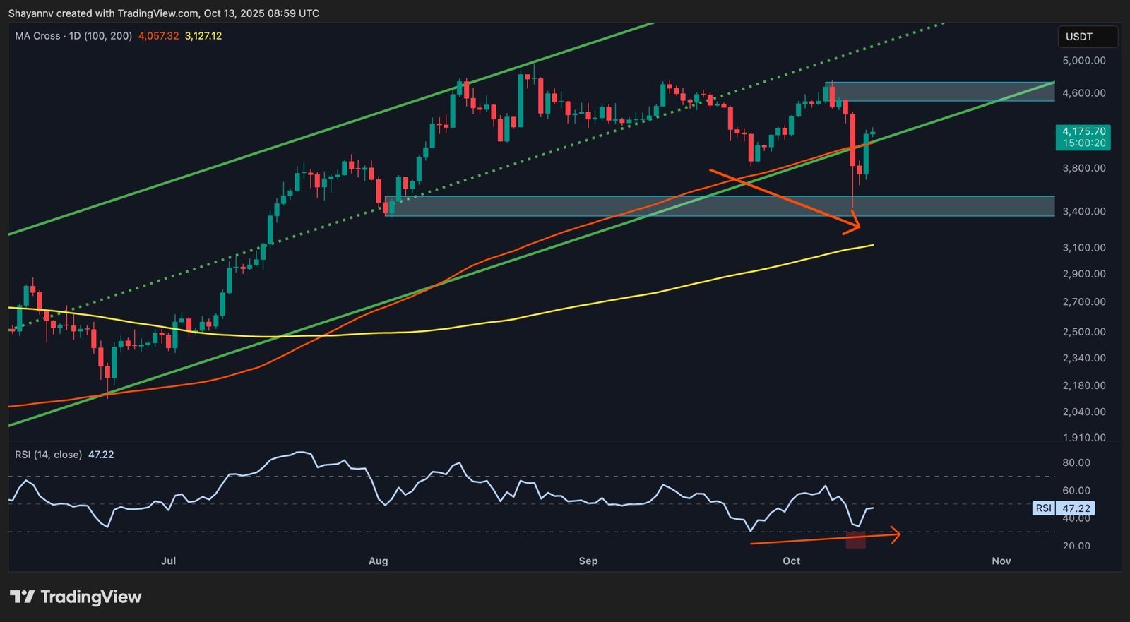 A daily close above $4.3K would confirm strength and open the path toward the $4.6K–$4.7K supply area, while rejection at this level could trigger another retest of the $3.8K–$3.6K range, where buyers would again be tested.