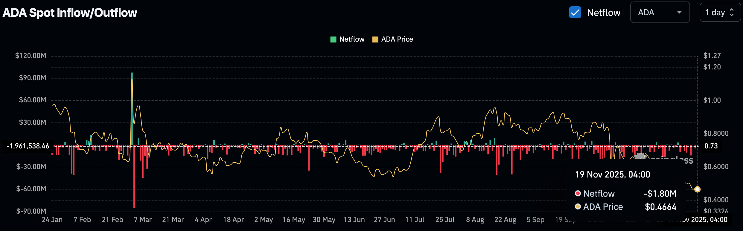 Recent on-chain data shows continued outflows from spot exchanges. On November 19, net outflows totaled $1.80 million, according to CoinGlass. Traders appear to be withdrawing ADA from exchanges, possibly for long-term holding.