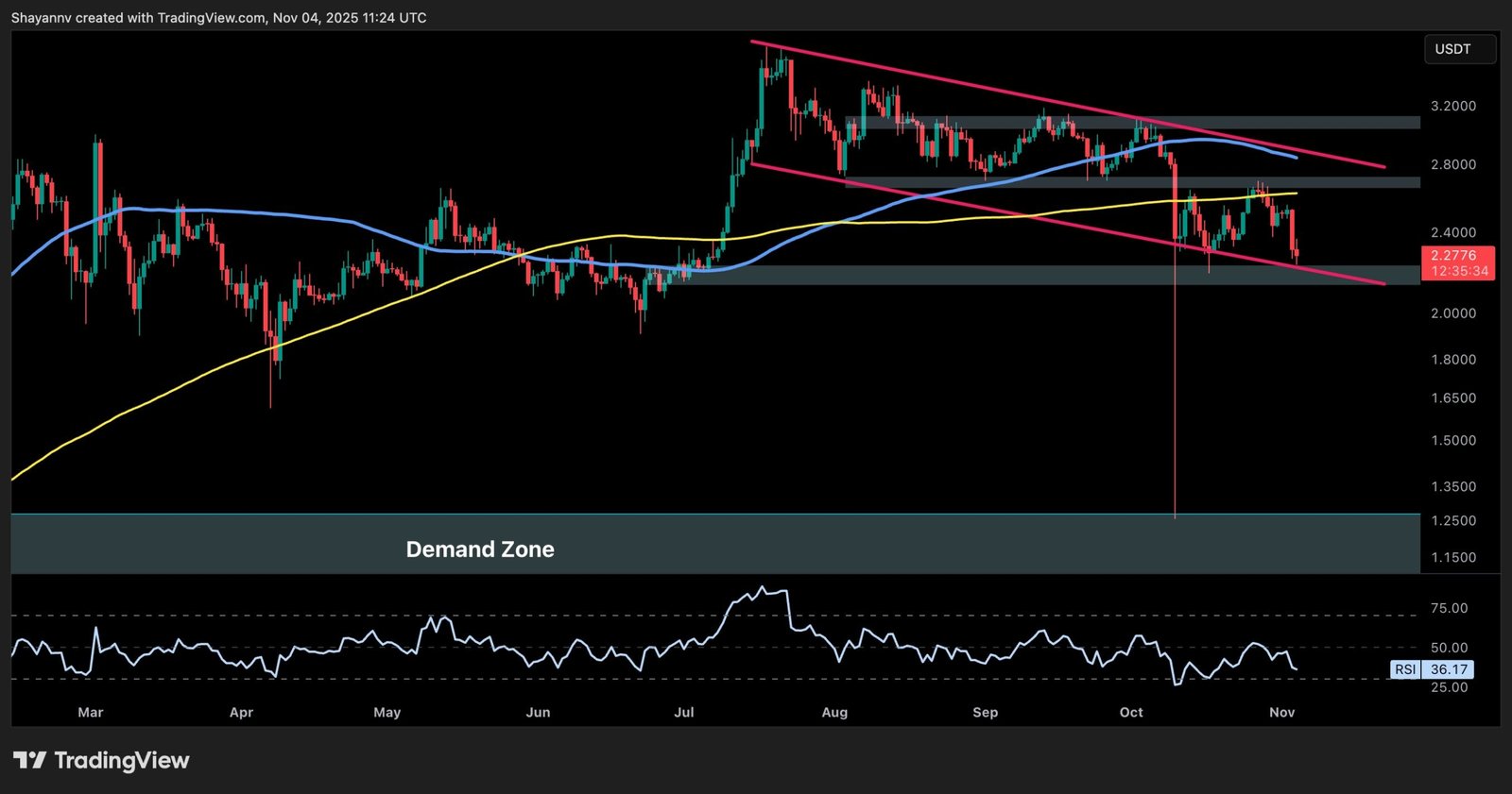 On the USDT pair, XRP is on the verge of breaking below the descending channel support and is also testing the demand zone around the $2.20 level. The asset has also been repeatedly rejected by both the 100-day and 200-day moving averages, both of which are located above the price, and is now printing a series of lower highs and lower lows.