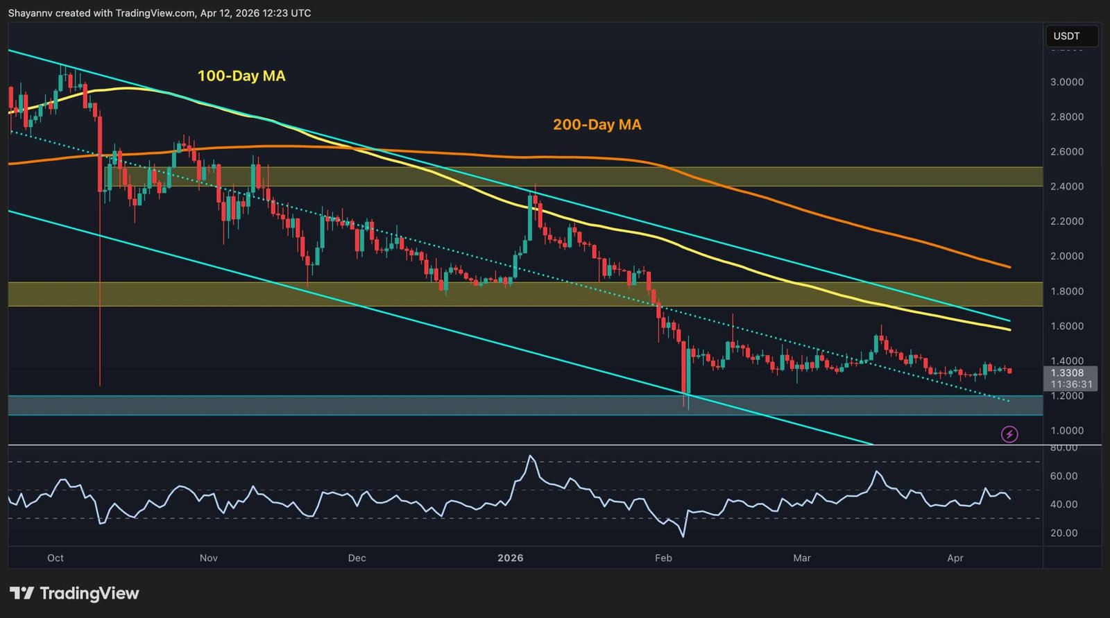 The structure on the USDT pair remains firmly bearish. XRP is trading inside a descending channel with both the 100-day MA (~$1.60) and 200-day MA (~$1.90) declining well overhead. The asset has been grinding lower in a slow bleed that has now brought it uncomfortably close to the $1.20 support zone.