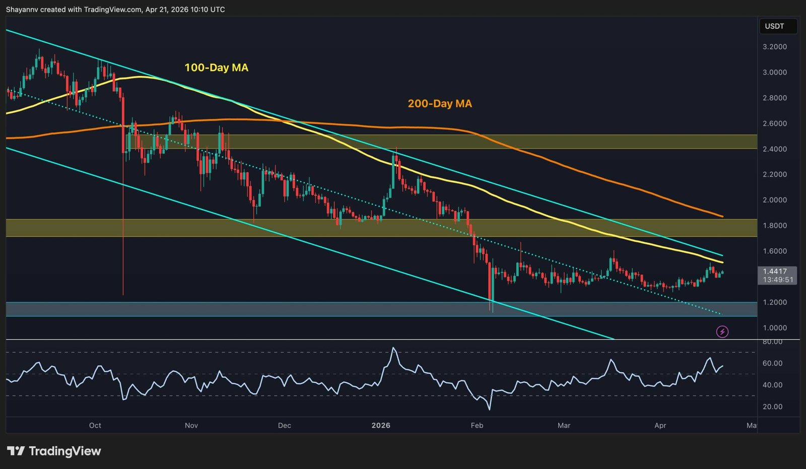The $1.80 supply band above the 100-day MA remains the first level that would genuinely shift the narrative, but getting there requires clearing the moving average and the channel’s upper boundary. Below, the $1.20 demand zone is the only thing standing between the current price and a psychological and structural breakdown toward $1.00.