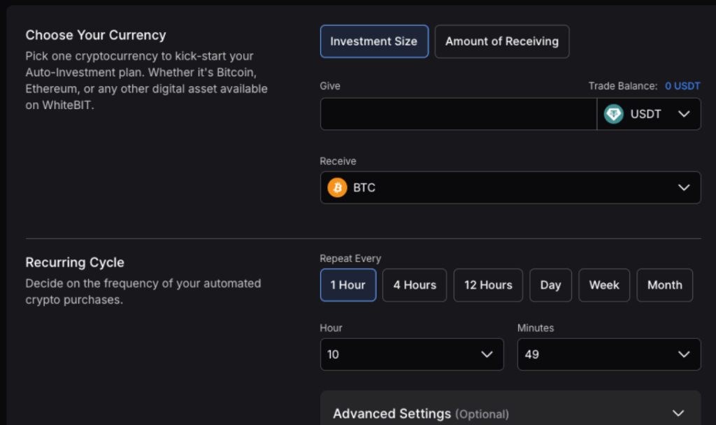 However, the key advantage of WhiteBIT’s Auto-Invest Tool lies in its advanced customization options, which provide users with greater control and management over their investment strategies. Using this feature, they can: