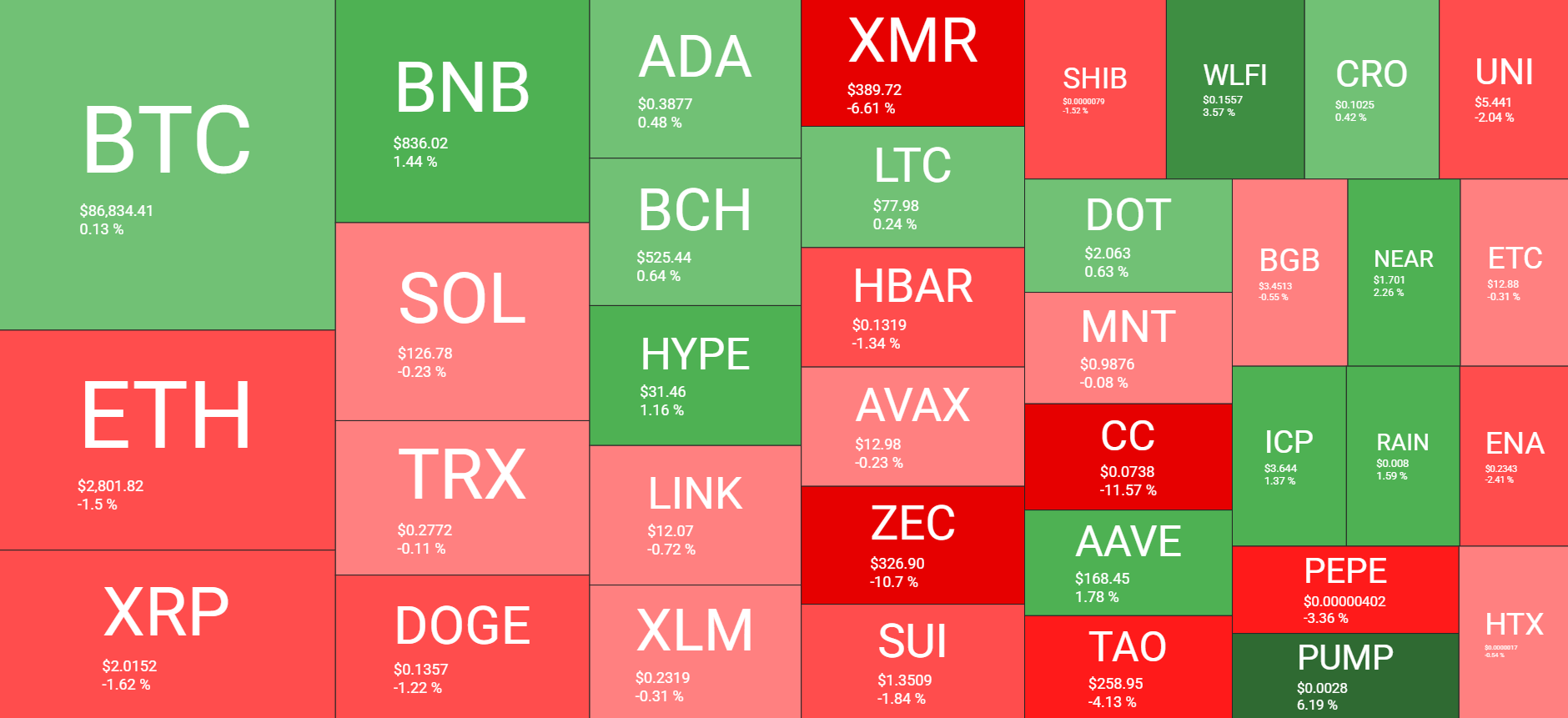 Most alternative coins also suffered, with ETH slipping to $2,800 and XRP testing the crucial $2.00 support. XMR, ZEC, and CC have plunged hard over the past 24 hours.