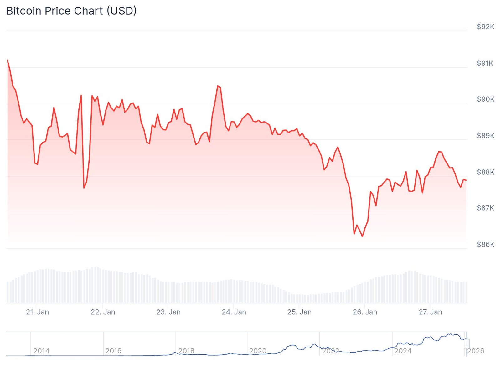 - Bitcoin declined to $88,400, down 4% over the past week as cryptocurrencies underperformed rising stocks and precious metals