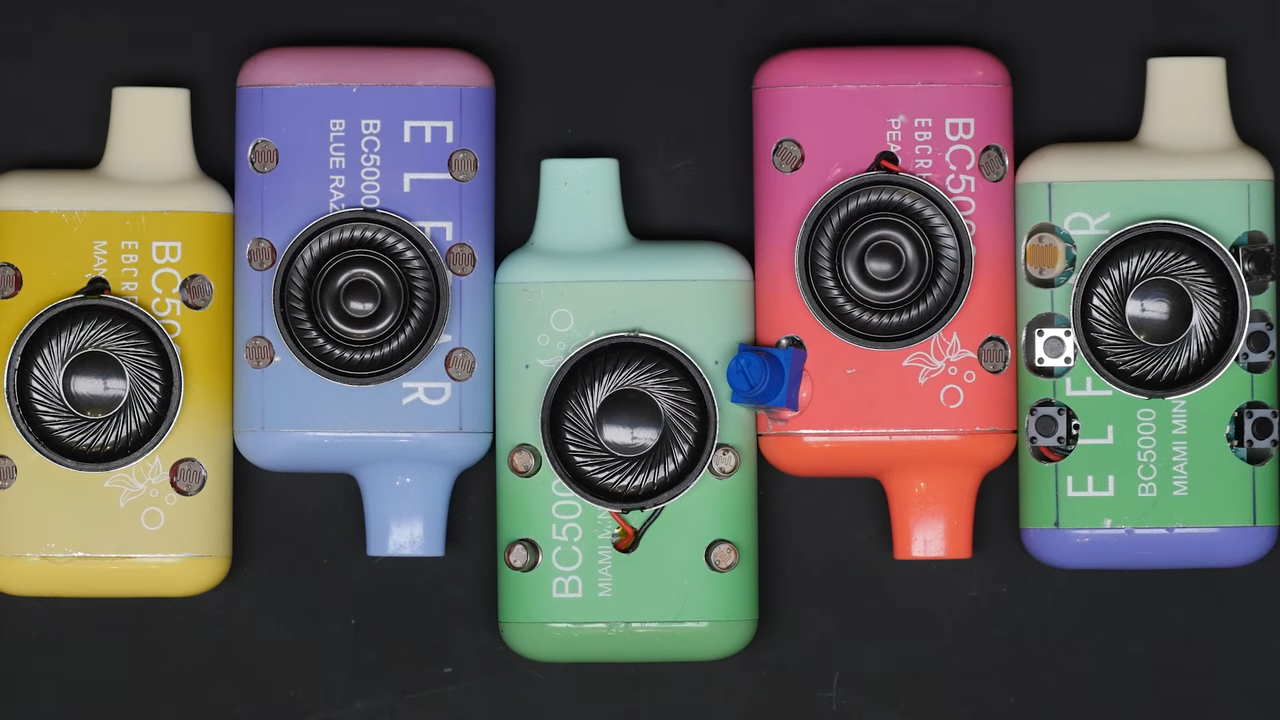 The build started with an ElfBars BC5000 vape. [Becky] notes there may be similar models under different names out there that would work just as well. The vape is effectively gutted for parts, with the LiPo cell, USB charging board, and the low-pressure sensor the main things that remain. These parts are combined with a drop-in 555 synthesizer circuit complete with speaker, which has its pitch controlled by a series of six photoresistors. When the low pressure sensor is triggered by inhalation, the 555 circuit is triggered, and operates at a pitch depending on the resistance of the photoresistor stack.