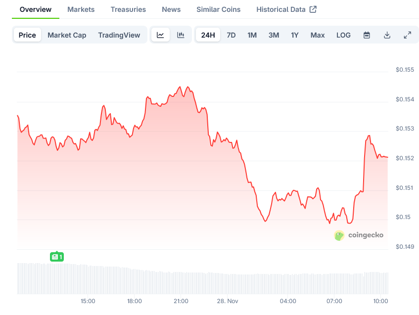 Dogecoin price continues to trade above $0.15, currently sitting at $0.1530 after gaining 1% in the past 24 hours. The price movement follows a recovery period after last week’s decline.