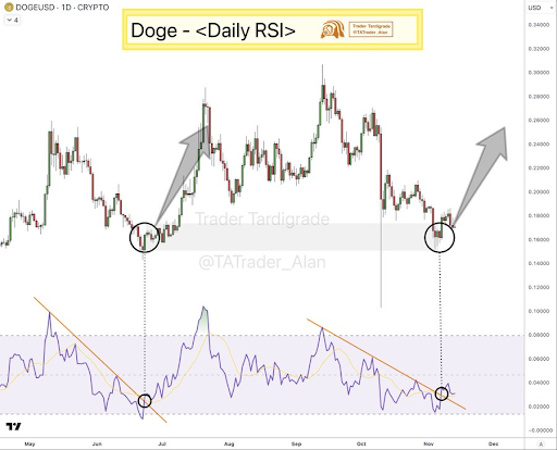 According to an analysis prepared by Trader Tardigrade, Dogecoin price initially rose from around $0.060 in May, reaching a peak above $0.300 by early July. This upward trend was confirmed by the RSI breaking above a descending trendline. However, the price subsequently dropped, touching a low point near $0.160 by mid-November. During this period, the RSI showed a trend reversal, breaking below its previous uptrend. As of the current data, Dogecoin’s price has returned to the $0.160 level.