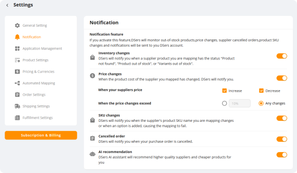Do not forget to turn on the notification in DSers settings page, which can help you to show the tips when the suppliers’ products out of stock or change the cost!
