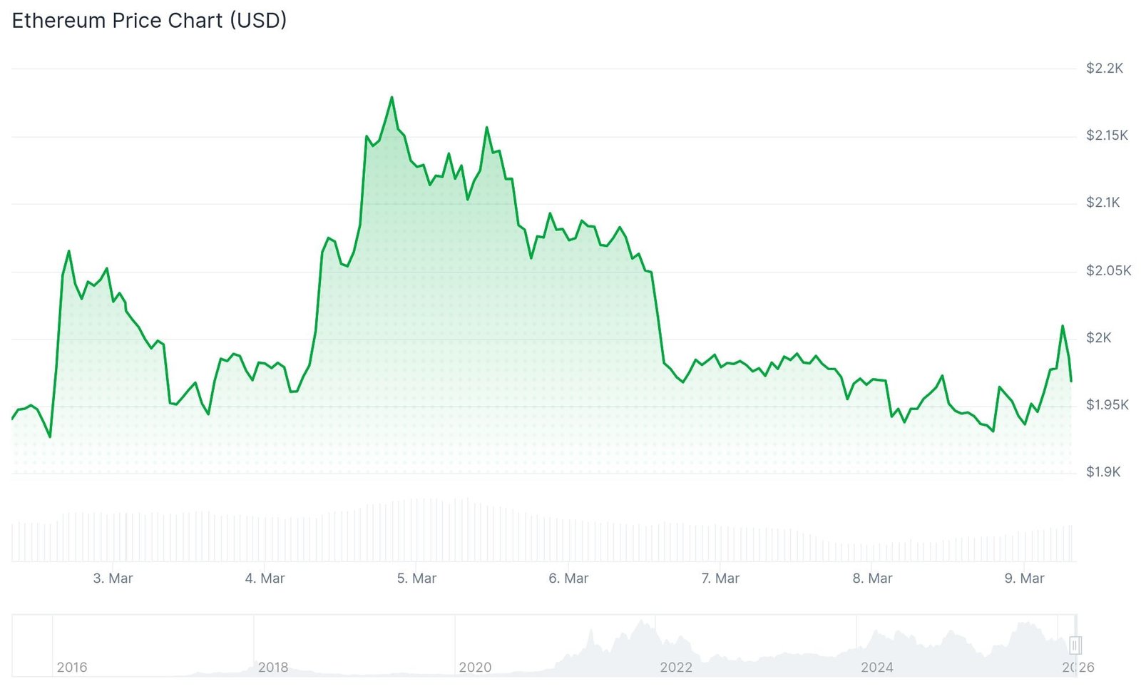 As of March 9, 2026, ETH was hovering around $1,939, continuing to struggle beneath the $2,000 threshold that has proven difficult to sustain.