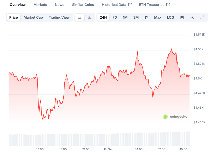 At the time of writing, Ethereum is trading at approximately $4,511-$4,518, holding firm above the 50-day EMA at $4,275. The cryptocurrency has maintained an ascending trendline, preserving its broader uptrend structure.