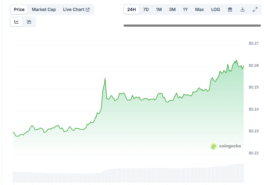 Data from CoinGecko shows FET trading at $0.2623 at publication time. The token posted a 13.67% gain over 24 hours. Weekly performance stands at a 20.67% increase.
