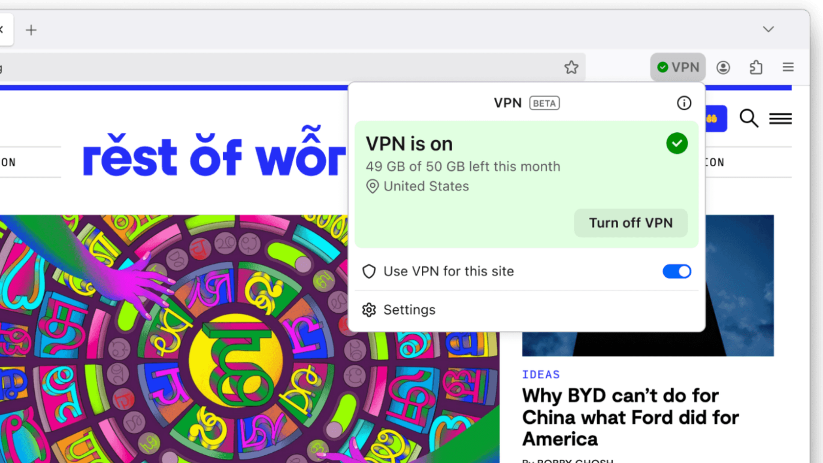 Second, like most free VPNs, there’s a limit to how much data you can use. Firefox users will get 50 gigabytes of VPN-protected traffic a month, metered whenever the VPN toggle in the toolbar is on. That’s actually pretty darn generous for a free service. For the sake of comparison, I generally go though about 400 GB of data in a month on my home system, combining a full-time job and constant video/audio streaming. Various estimates from the last few years put the average US household internet use at 500 to 1,000 GB a month, with a lot of variation.