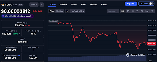At the time of writing this article, CoinMarketCap data reveals that the price of FLOKI has decreased by 5.9% in the last 24 hours, now standing at $0.00003812. Throughout the observation period, the price fluctuated.