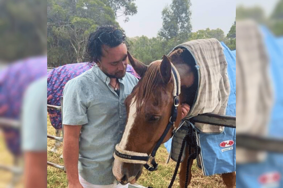 Former unregistered NDIS director faces 15-year jail term for alleged $858k misuse. A man stands beside a brown horse in a paddock, gently leaning his head toward the horse as it wears a fly mask and rug, with trees in the background.