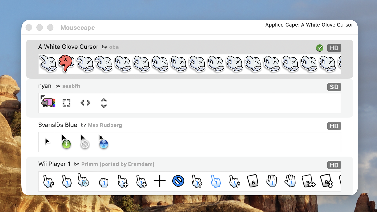 Unless, that is, you install the free and open source Mousecape. This application lets you create a cursor, then use it in place of the default system ones. You can also install cursors made by others. There’s no centralized collection of cursors for this, unfortunately, but I found a fun hand on Github, some Wii cursors, and a decent collection on DeviantArt. You could also try your hand at creating your own set.
