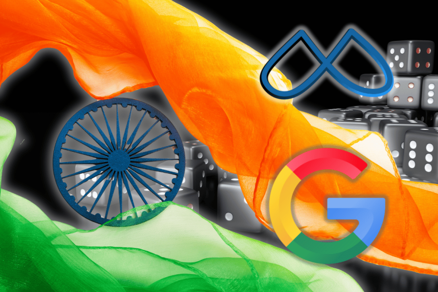 Google and Meta may lose legal shield amid Indian betting probe. Illustration featuring the Indian flag colors with the Ashoka Chakra, Google and Meta logos, and black dice in the background, symbolizing a legal investigation into online betting activities involving the tech giants in India.