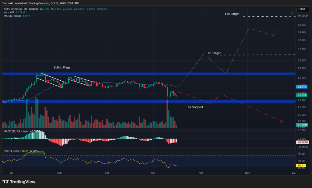 Technical indicators highlight three bullish flag formations across 2025, two of which appeared over the summer. These setups often precede major price breakouts, and XRP’s patterns have yet to fully play out.