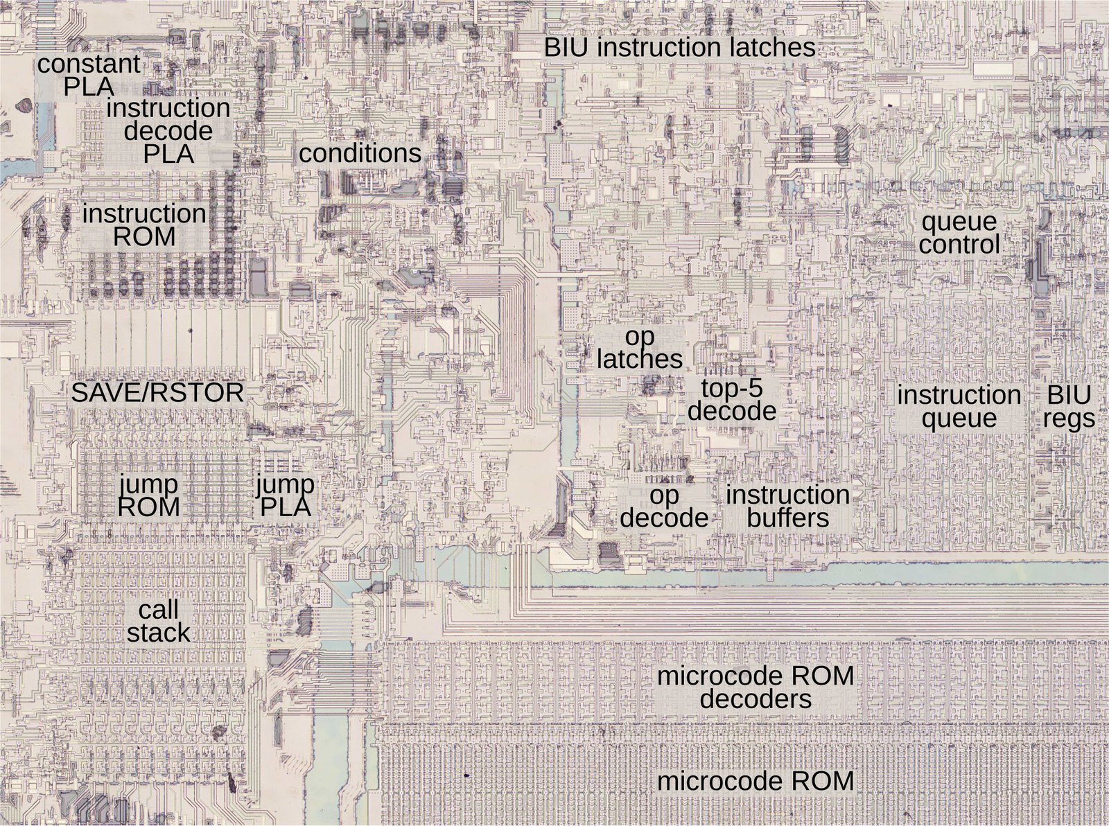 This decoding is mostly done by the microcode engine, with conditional instructions like cos featuring circuitry that sprawls all over the IC. Explained in the article is how the microcode engine even knows how to begin this decoding process, considering the complexity of these instructions. The biggest limitation at the time was that even a 2 kB ROM was already quite large, which resulted in the 8087 using only 22 microcode entry points, using a combination of logic gates and PLAs to fully implement the entire ROM.