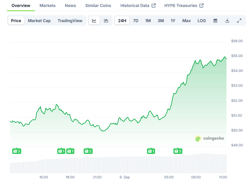 - HYPE price reached a new all-time high of $53.44, representing a 1,200% increase from 2024 lows