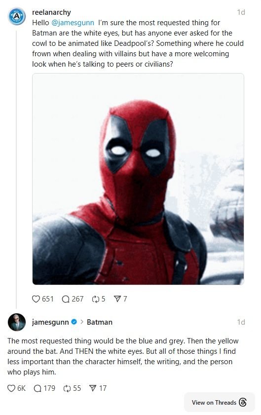 As we saw on CBR, Gunn responded to a fan who asked about DCU Batman having white eyes (rather than the actor’s human eyes) and whether they could be animated like Deadpool’s. The fan alluded to this being surely the DC Studio head’s number-one fan request. Not so, says Gunn. It’s third.
