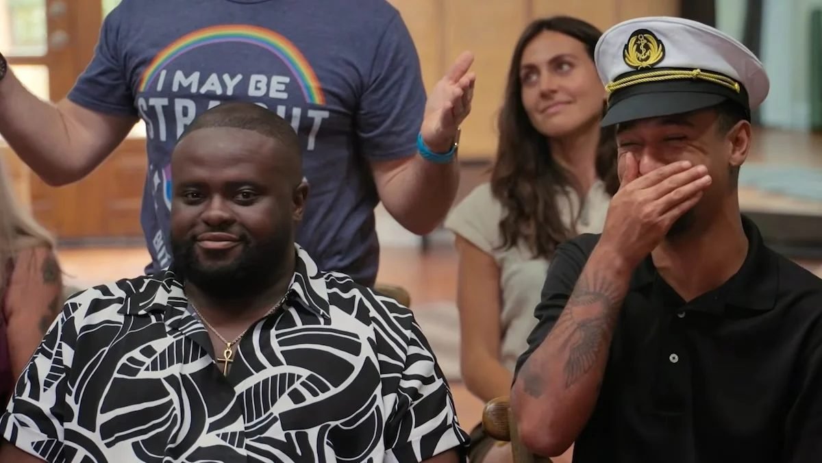 A man in a captain hat covers his face while laughing seated next to a man looking at the camera on Jury Duty Presents: Company retreat