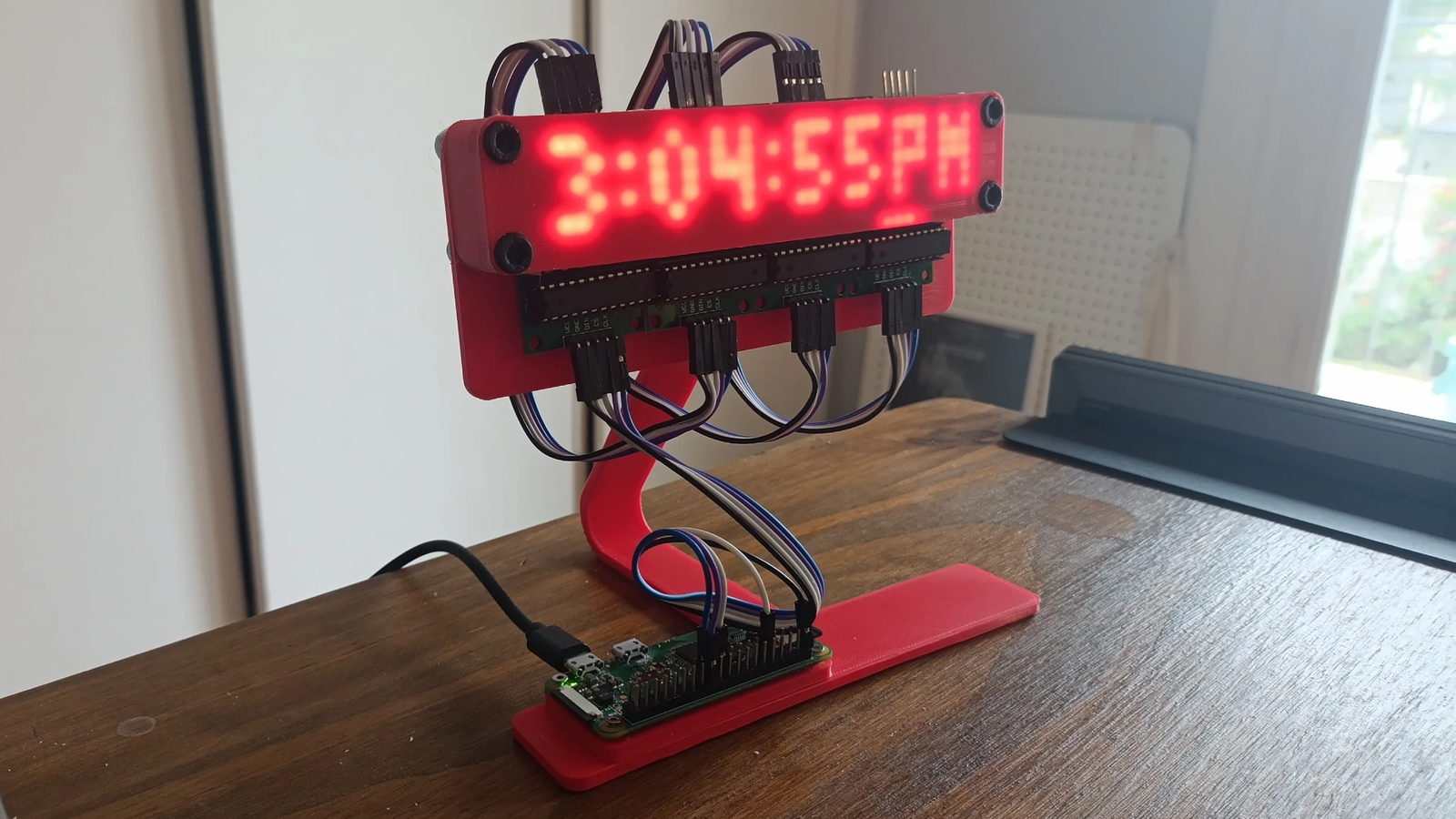 The exception is the four MAX7219 LED matrices whose faces are hidden behind a featureless red panel, and for good reason. As soon as the clock powers up, the LEDs shine through the thin red plastic in a clean glow that complements the rest of the clock nicely.