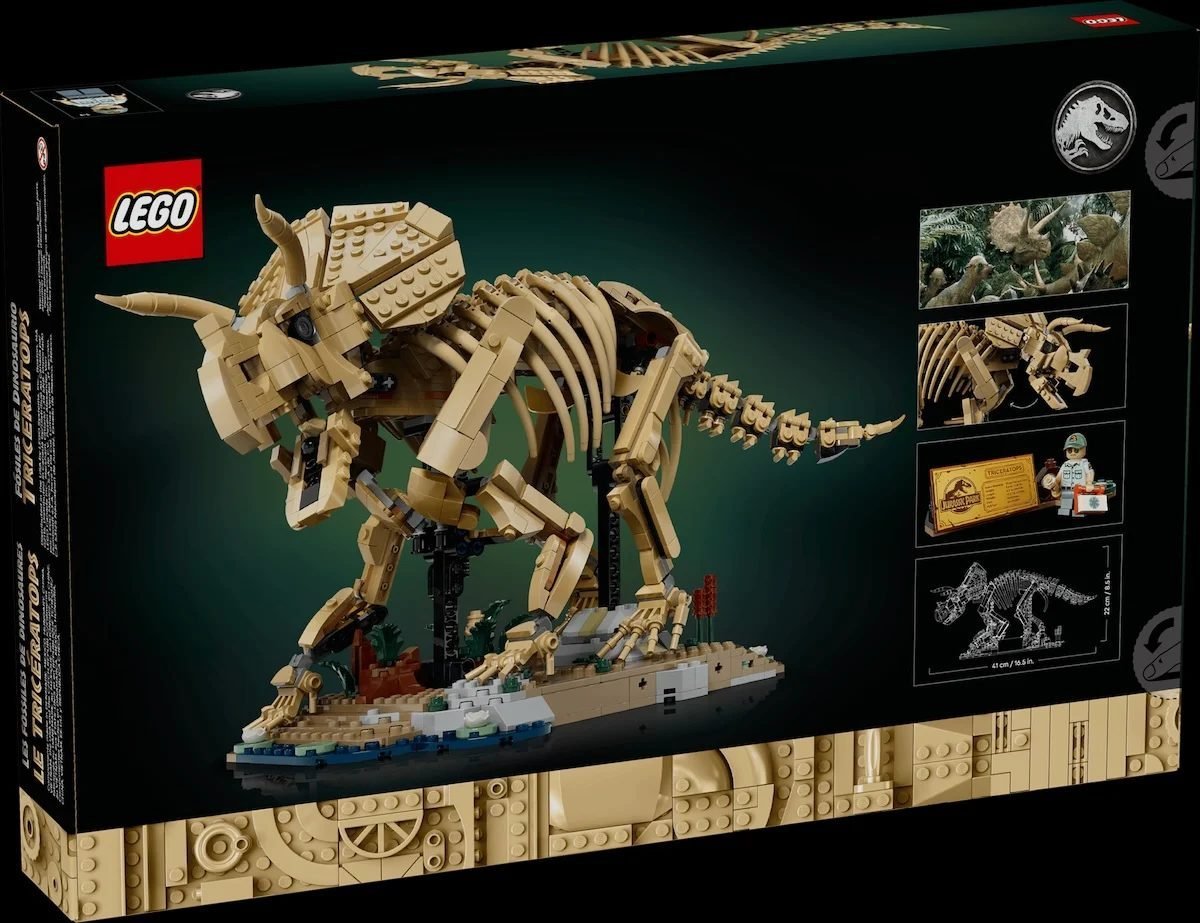 LEGO's Triceratops skeleton fossil set on display on the box cover