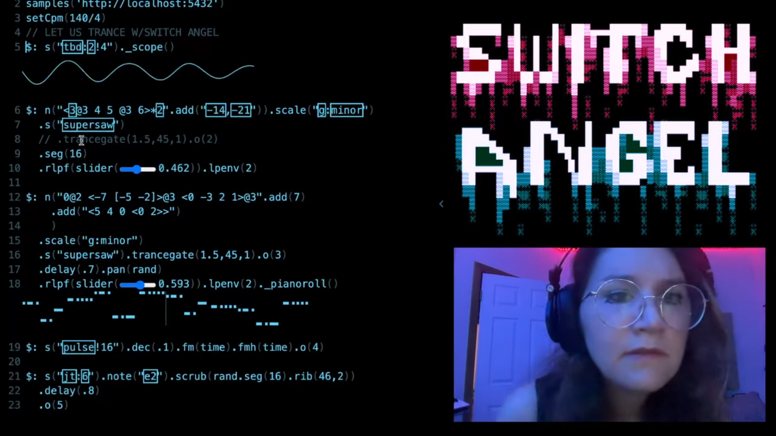 The super talented [Switch Angel] is an electronic music artist, with a few cool YouTube videos to show off their absolute nailing of how to live code with Strudel. For us mere mortals, Strudel is a JavaScript port of TidalCycles, which is an algorithmic music generator which supports live coding, i.e. the music that is passed down to the synthesizer changes on-the-fly as you manipulate the code. It’s magical to watch (and listen!) to how you can adapt and distort the music to your whims just by tweaking a few lines of code: no compilation steps, hardly any debugging and instant results.